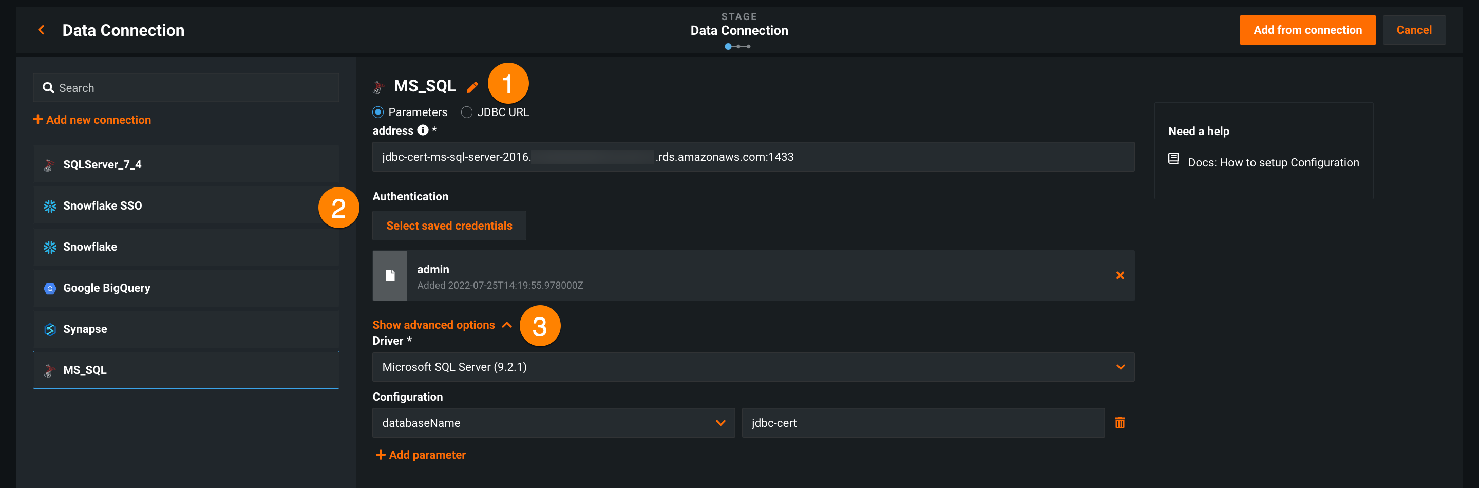 Note that the visible configuration options are the required parameters for the selected data store; therefore, these options vary for each data store. You can add more parameters under Show advanced options (3).