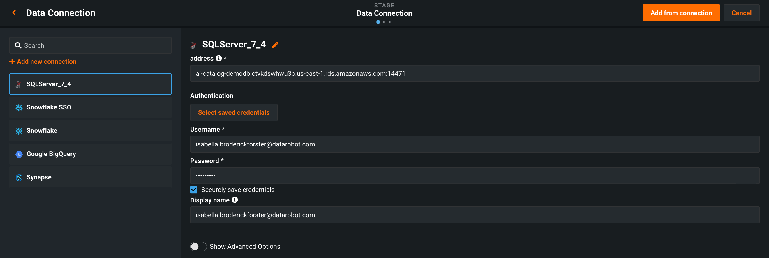 You can also create a new data connection using the AI Catalog by selecting Add to catalog > New Data Connection.