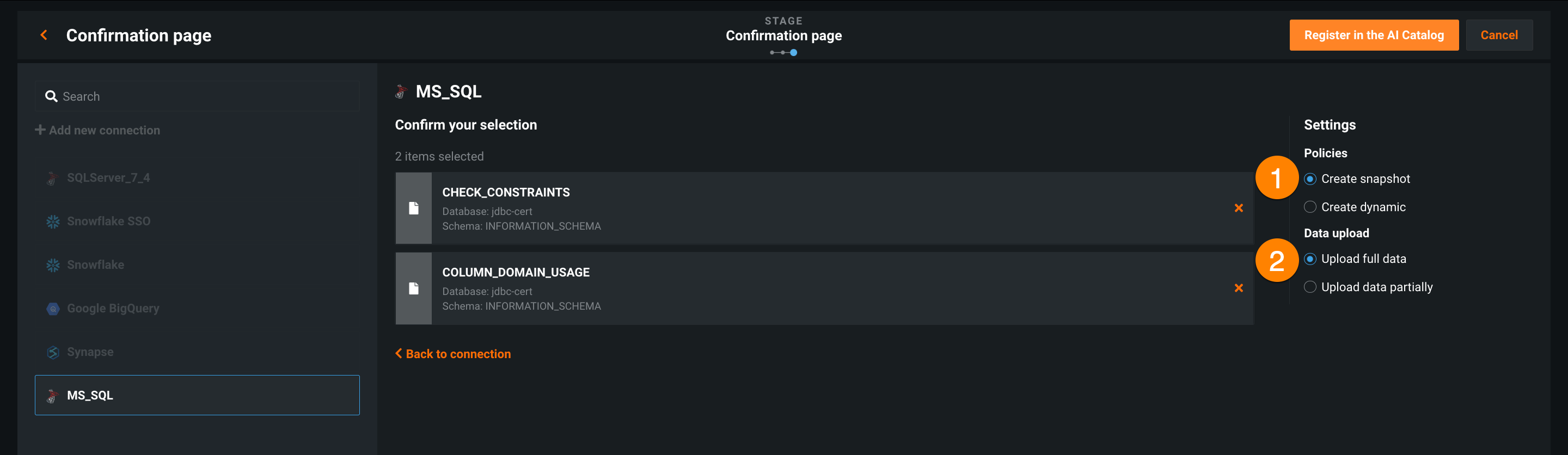 Under Settings, select the appropriate policy (1) and data upload amount (2), then review and confirm your selections by clicking Register in the AI Catalog.