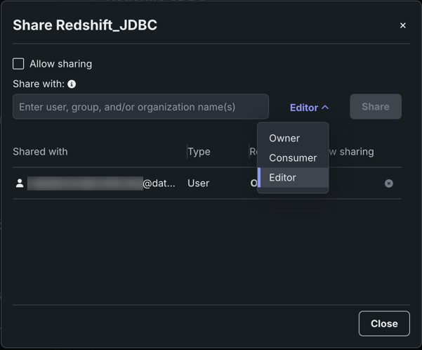 When you invite a user, user group, or organization to share a data connection, DataRobot assigns the default role of Editor to each selected target (not all entities allow sharing beyond a specific user). You can change the role from the dropdown menu.