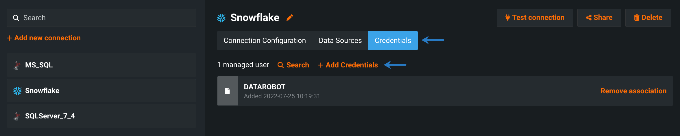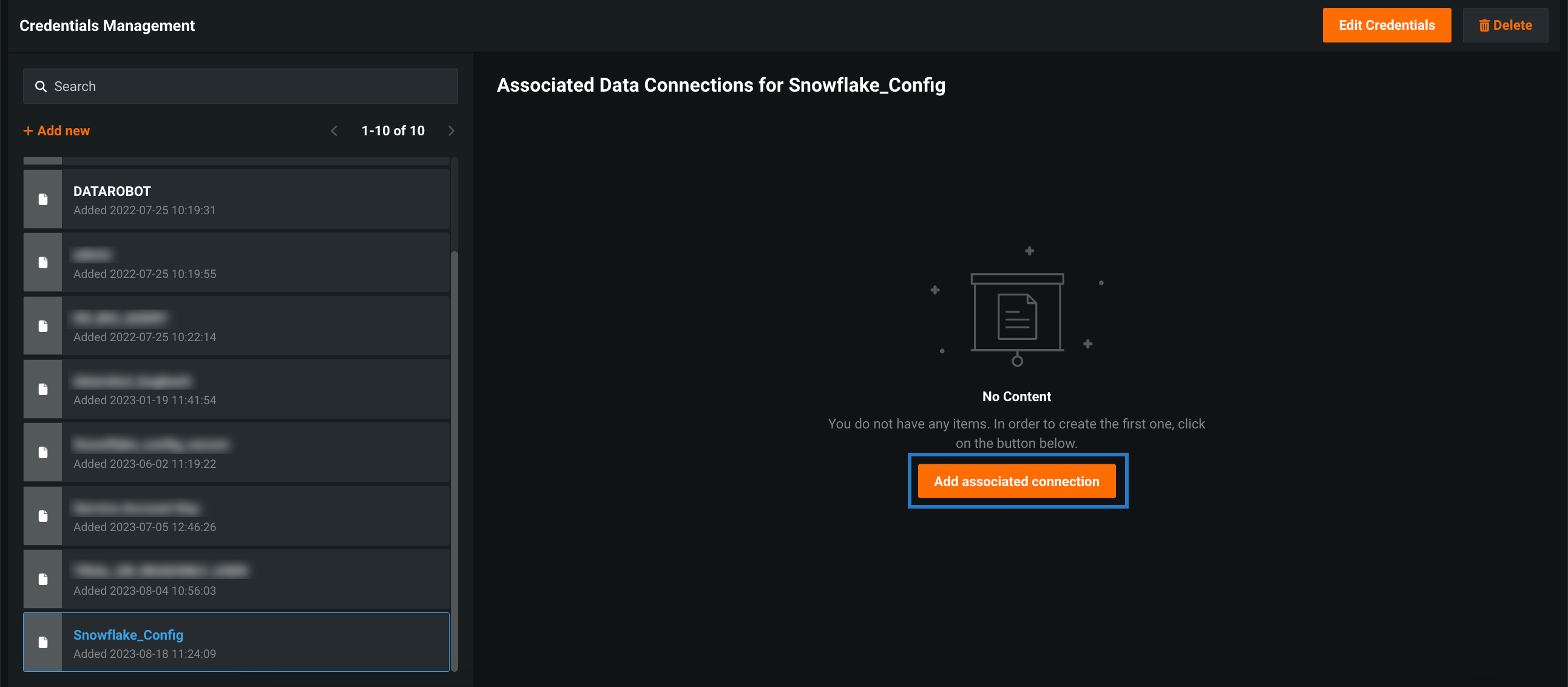 When adding a secure configuration from the Credentials Management page, you first add your credentials and then select a data connection to associate with those credentials: