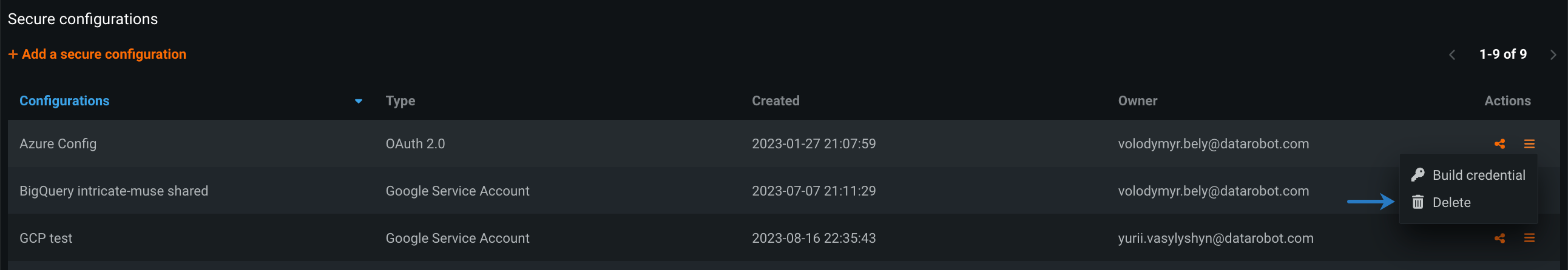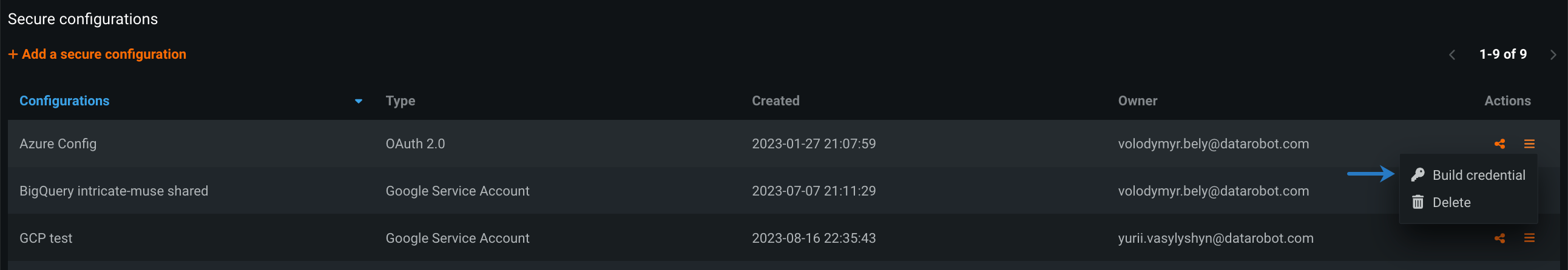 To build credentials from an existing configuration, click the Actions menu next to the configuration, and select Build credentials.