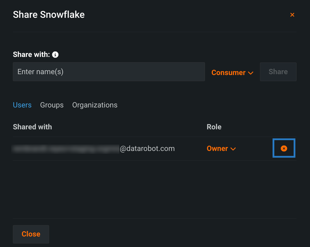 To revoke access to a shared secure configuration, click the Share icon next to the configuration and click the X next to the user, group, or organization.