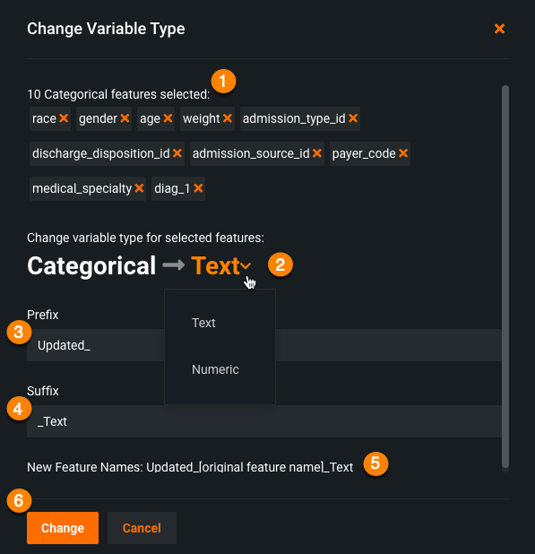 To modify the variable type for multiple features as a single batch operation, use the Change Variable Types option from the menu. This option is useful, for example, if you want to transform all features of one variable type.