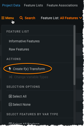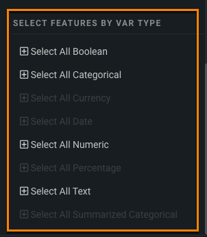- If you want to select all features for a variable type: From the menu, under Select Features by Var Type, select the variable type you want to transform for the dataset. Only variable types present in the dataset can be selected.