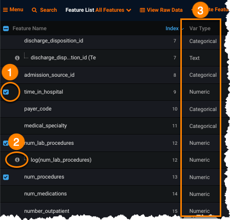 - If you want to manually-select features: Select each feature you want to transform (1). Make sure you do not select any previously-transformed features (2) and that all features you select are of the same variable type (3).