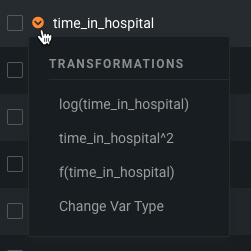 | Transformation options (2) | Selects a new feature type, via the dropdown, from the available variable types for the current feature. DataRobot performs specific transformations for numeric and categorial variable types. |
