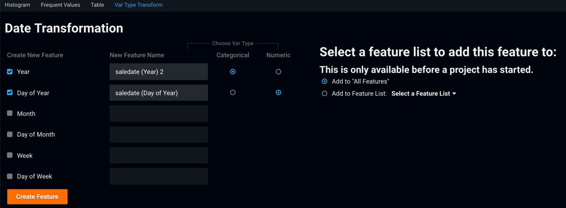 | New Feature Name (3) | Provides a field to rename the new feature. By default, DataRobot uses the existing feature name with the new variable type appended. |