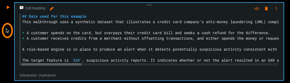 | Move cell | Moves a cell to a new location in the notebook via the drag icon in the top center of the cell. |