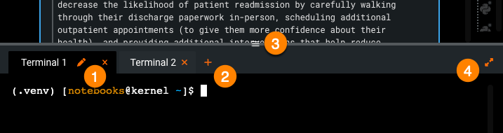 2 Add new terminal window To add an additional terminal session, click the plus sign (+) next to the terminal window name. This will create an additional terminal window as a tab, allowing you to work in multiple windows simultaneously.