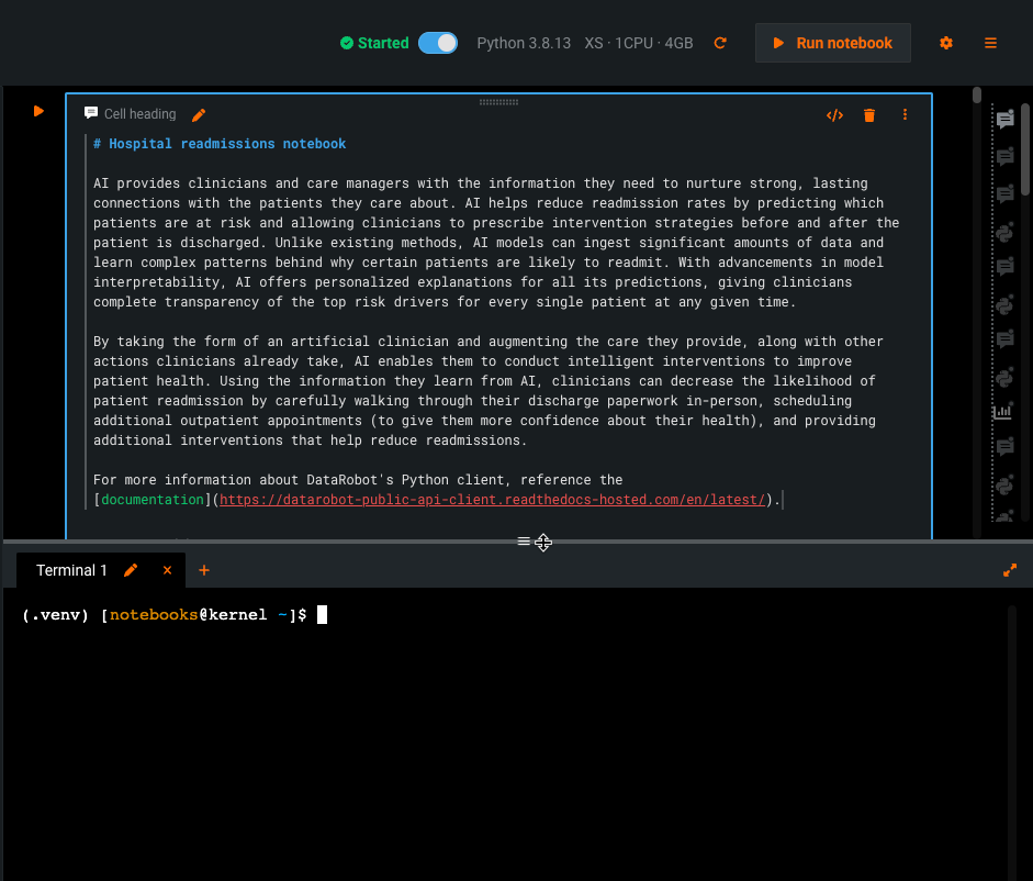 DataRobot notebooks support integrated terminal windows. When you have a notebook session running, you can open one or more integrated terminals to execute terminal commands such as running .py scripts or installing packages. Terminal integration also allows you to have full support for a system shell (bash) so you can run installed programs.