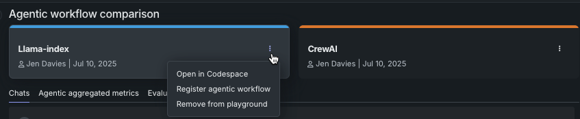 | Remove from playground | Delete the agentic workflow from the playground. Removing an agentic workflow deletes it from the Use Case but does not delete it from Workshop. All playground-related information stored with the workflow, including metrics and chats, are also removed. |