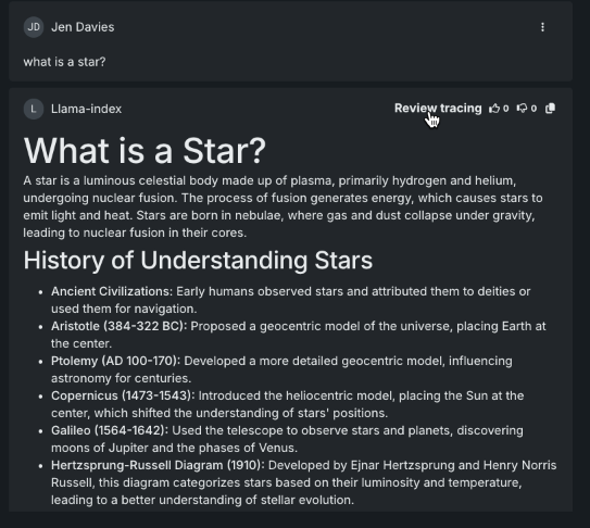 | Response header | Review tracing | Opens the tracing details panel, illustrating the path a single request takes through the agentic workflow. |