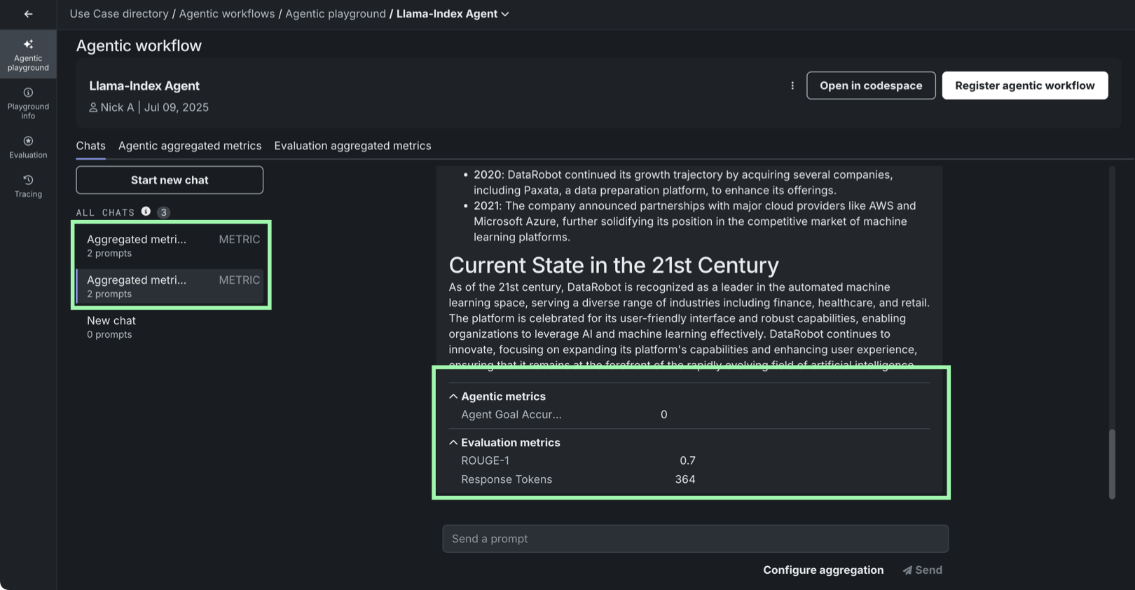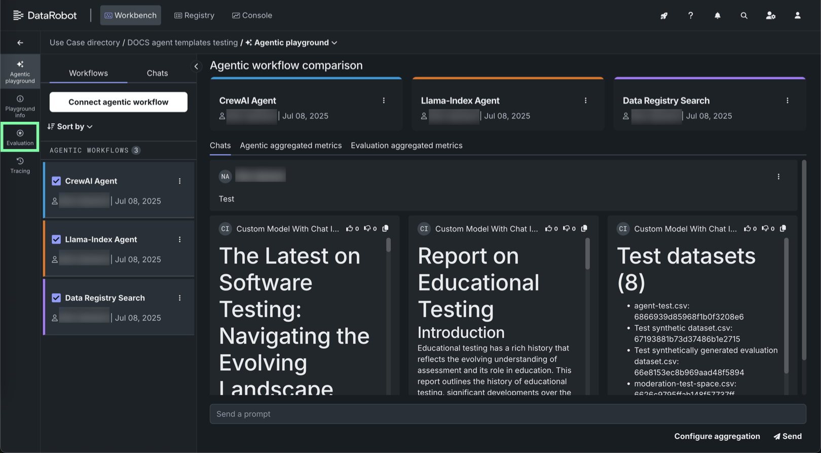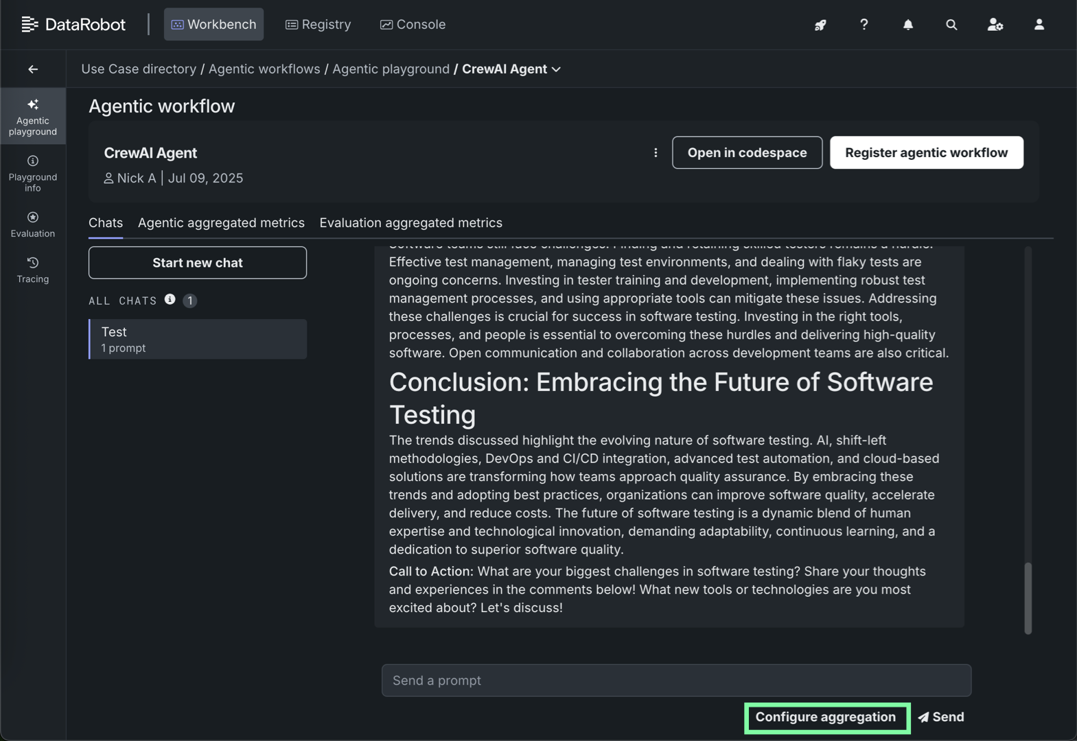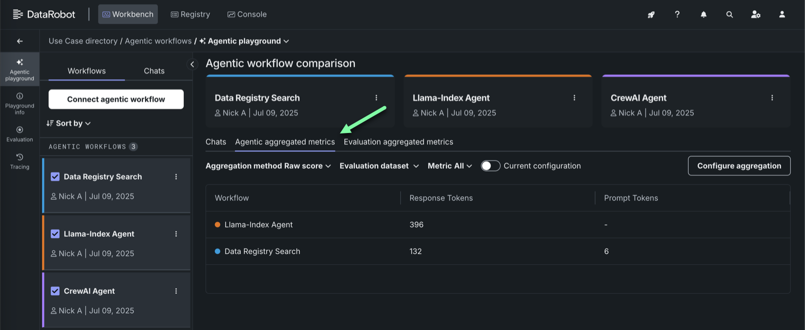 In the agentic playground, click Configure aggregation below the prompt input (from the Workflows tab, or in an individual agent Chats tab):