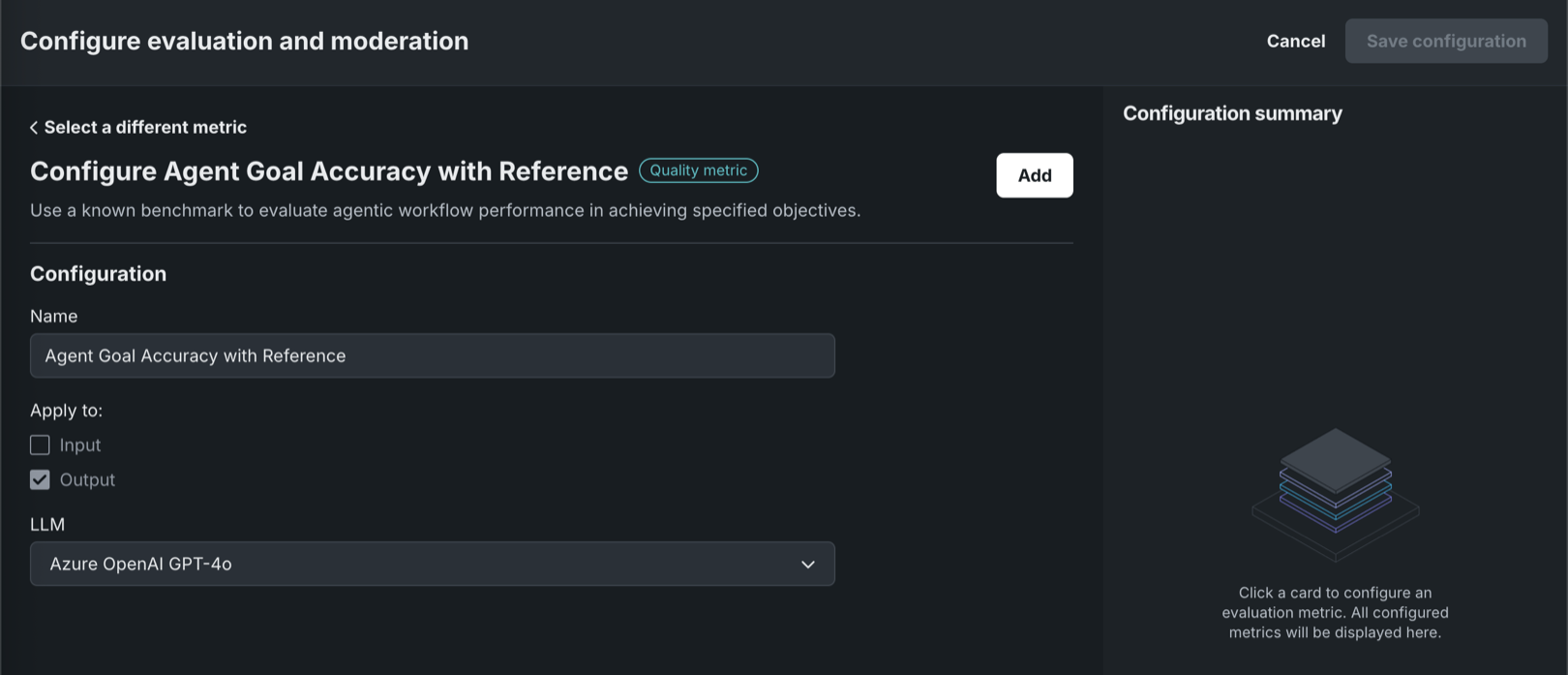 On the Evaluation and moderation page, click the Playground metrics tab, then click Configure metrics.
