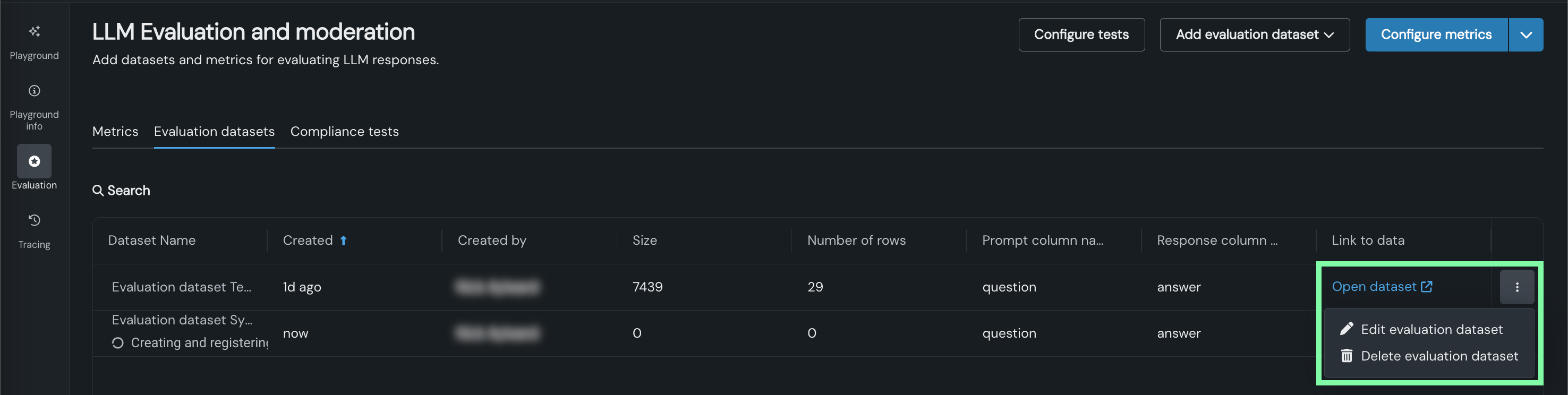 - Click the Actions menu to Edit evaluation dataset or Delete evaluation dataset:
