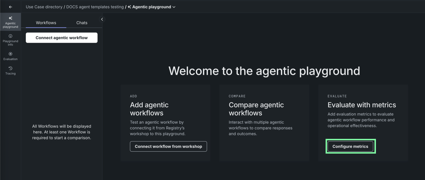To enable playground metrics for your workflows, add one or more evaluation metrics to the agentic playground. In addition, you must provide reference data using evaluation datasets.