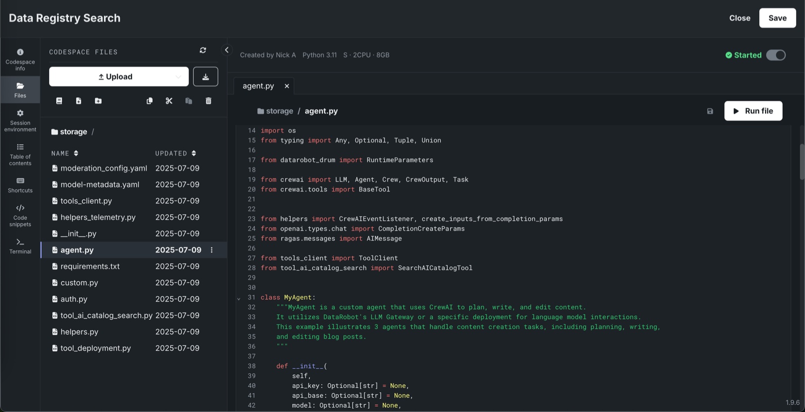 Codespaces are the primary method for developing your agentic workflow while testing in an agentic playground. In DataRobot, a codespace is a development environment you can use to view, modify, and run your agent's files. Changes made in the codespace are passed on to the agentic workflow in the agentic playground, as well as the custom agent in the Registry workshop.