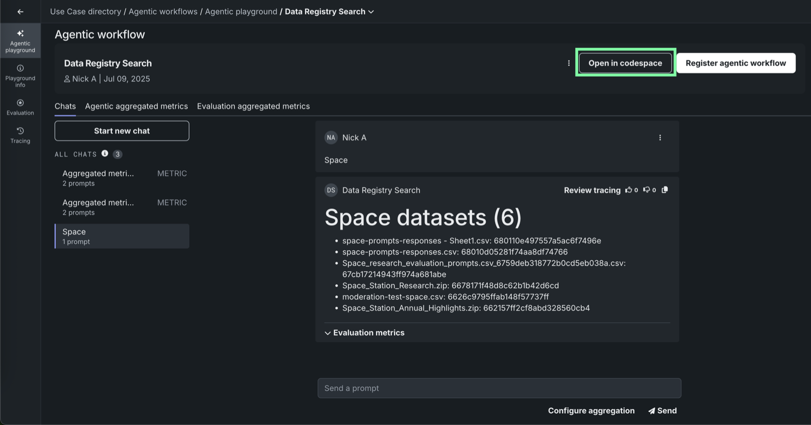 After you've connected an agentic workflow custom model to an agentic playground, as you compare and test the workflow, you can modify the workflow's code in a codespace or in the Registry workshop. Changes to the code are reflected in the agentic playground, allowing agentic workflow builders to experiment until they build a production-ready agentic workflow for deployment to Console.