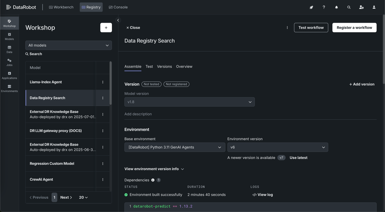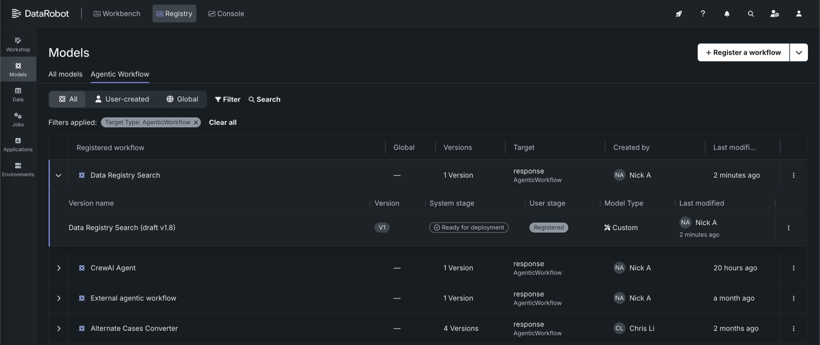 After experimenting in the agentic playground to build a production-ready agentic workflow, register the custom agentic workflow in the Registry workshop, in preparation for deployment to Console.