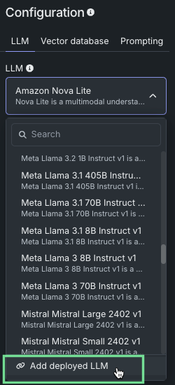 After you add a custom LLM and validation is successful, back in the blueprint's Configuration panel, in the LLM drop-down, click Deployed LLM, and then select the Validation ID of the custom model you added:
