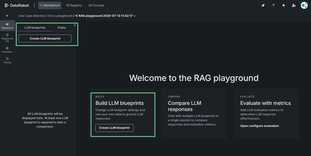 To create an LLM blueprint, select that action from either the LLM blueprints tab or, if it is your first blueprint, the playground welcome screen.