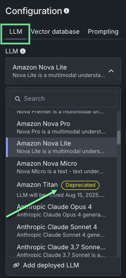 When creating LLM blueprints, be aware of LLMs marked with a Deprecated or Retired badge. The badges indicate notification of upcoming or current end of support. See further description here and a list of deprecated and retired LLMs on the LLM availability page.