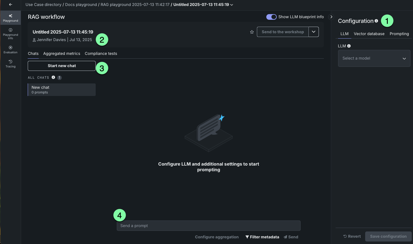 | 4 | Prompt entry | Accepts prompts to begin chatting with the LLM blueprint; the configuration must be saved before the entry is activated. |