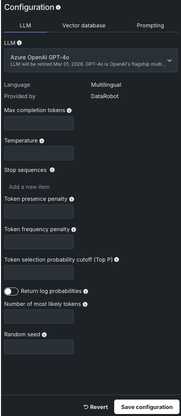 Alternatively, you can add a deployed LLM to the playground, which, when validated, is added to the Use Case and available to all associated playgrounds. In either case, selecting a base LLM exposes some or all of the following configuration options, dependent on the selection: