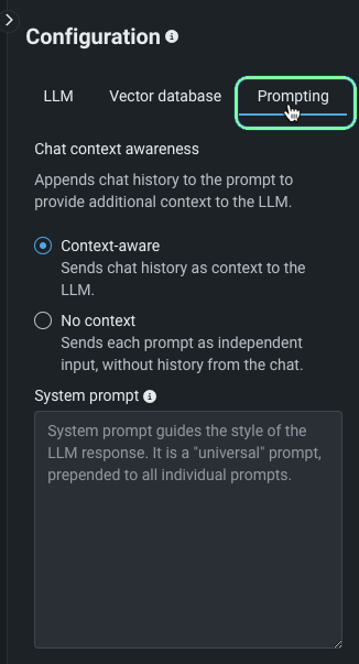The prompting strategy is where you configure context (chat history) settings and optionally add a system prompt.