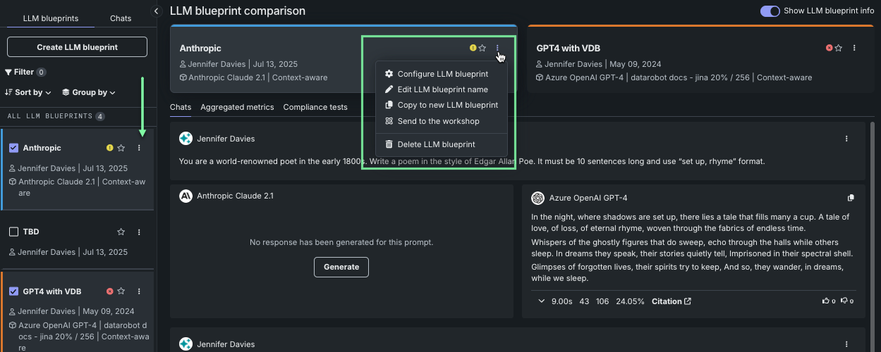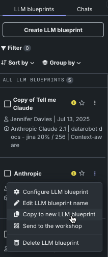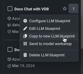| Copy to new LLM blueprint | Creates a new LLM blueprint from all saved settings of the selected blueprint. |