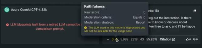 Some evaluation metrics, for example faithfulness and correctness, use an LLM in their configuration. For those, messages are displayed when viewing or configuring the metrics, as well as in the prompt response.