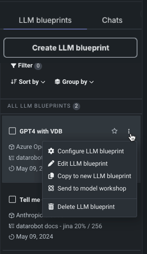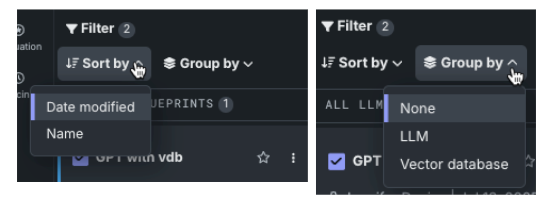 The Filter option controls which blueprints are listed in the panel, either by base LLM or status: