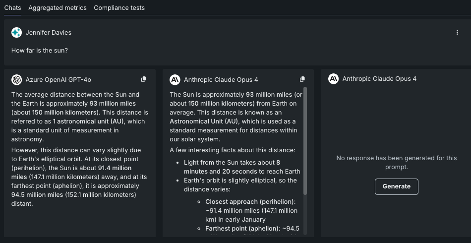 - Send a prompt from the central prompting window. Each of the blueprints receives the prompt and responds, allowing you to compare responses.