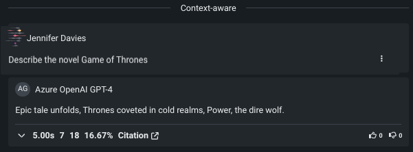 The following example compares three LLM blueprints, each with the same settings except using a different system prompt to influence the style of response. First test the system prompt, when configuring the LLM blueprint, for example: Describe the novel Game of Thrones.