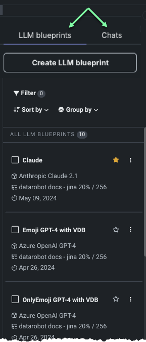 The LLM blueprints tab lists all LLM blueprints configured within the playground. It is from this panel that you select LLM blueprints—up to three—for comparison. As you select an LLM blueprint via the checkbox, it becomes available in the middle comparison panel. Click the star next to an LLM blueprint name to "favorite" it, which you can later filter on.