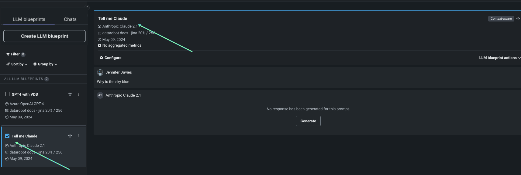 - From the LLM blueprints tab, select up to three LLM blueprints for comparison.