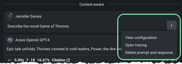 | View configuration | Shows the configuration used by that prompt in the Configuration panel on the right. If you haven't changed configurations while chatting, no change is apparent. Using this tool allows you to recall previous settings and restore the LLM blueprint to those settings. |