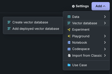 From within a Use Case, click the Add dropdown and expand Vector database: