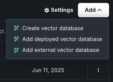 First, add a vector database from one of multiple points within the application. Each method opens the Create vector database modal and uses the same workflow from that point.