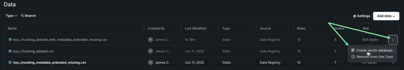 From the Data assets tile, open the Actions menu associated with a Use Case and select Create vector database.