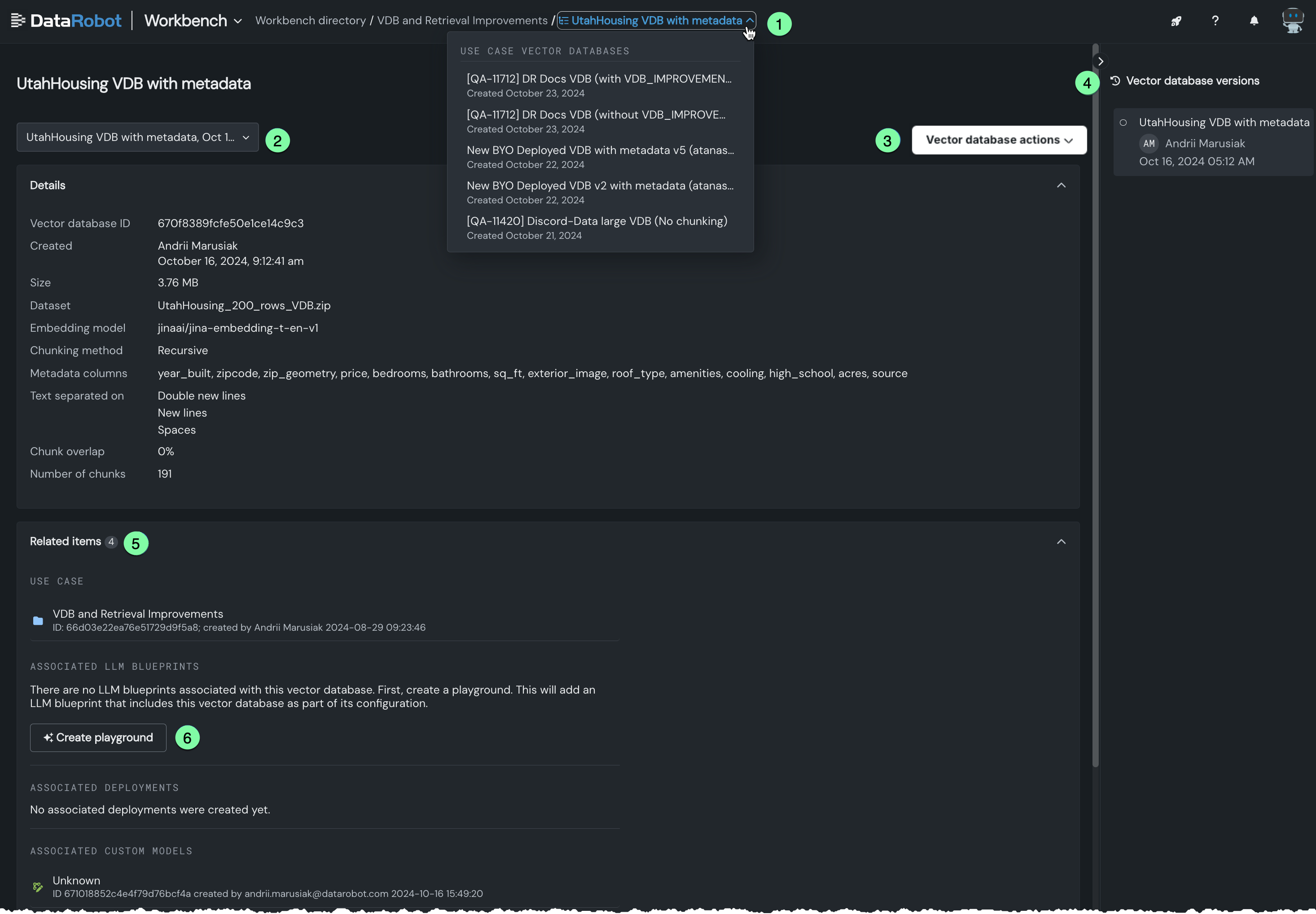 | 5 | View items associated with the vector database, such as the related Use Case and LLM blueprints and deployed customer and registered models that use the vector database. Click on an entity to open it in the corresponding Console tab. |