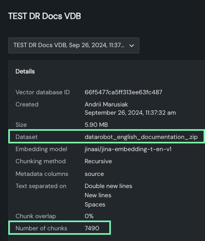 - Basic vector database metadata: ID, creator and creation date, data source name and size.