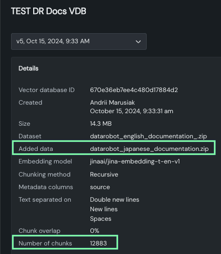 The details section of the vector database expanded view reports information for the selected version, whether you selected the version from the dropdown or the right-hand panel.