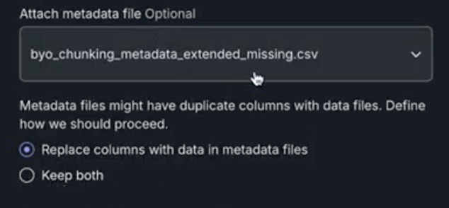 A dataset has col1 and col2. The metadata file has col2 and col3. The metadata going into the vector database is then col1, col2, and col3. Since col2 is a duplicate, DataRobot either does the following, based on the settings: