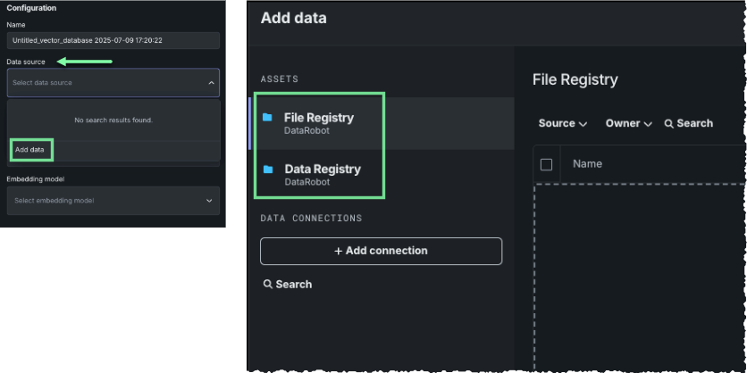 Select DataRobot for an internal vector database stored in the Data Registry.