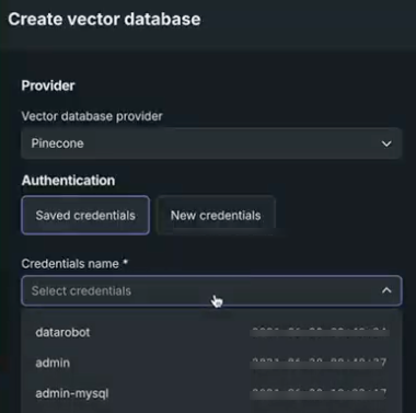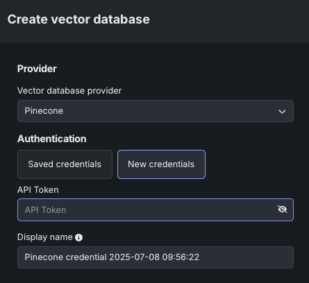 After selecting Pinecone as the provider, choose whether to use existing or new credentials.
