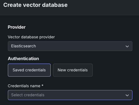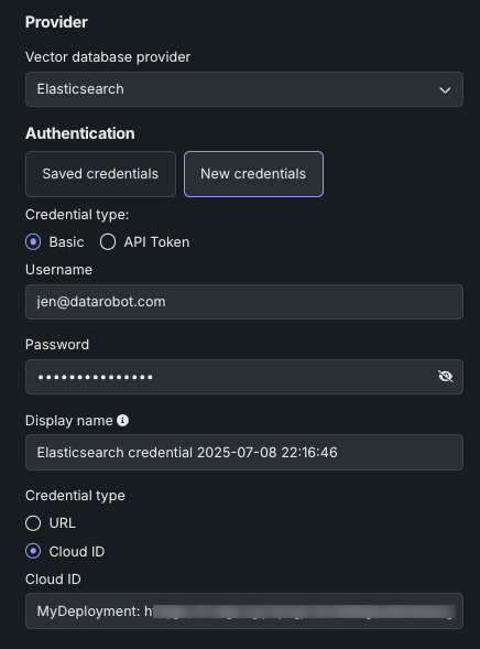 All connection requests to the Elasticsearch cluster must include a username and password (basic credentials) or an API key for connection authentication. The credentials are created in your Elasticsearch instance and stored in DataRobot's credential management system for reuse when working with Elasticsearch vector databases.