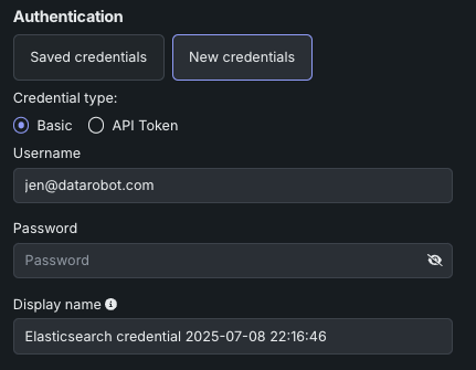 Basic: Basic credentials consist of the username and password you use to access the Elasticsearch instance. Enter them here and they will be saved to DataRobot.