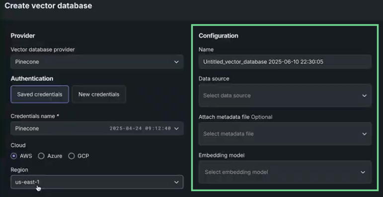 Once the token is input, select a cloud provider for your Pinecone instance—AWS, Azure, or GCP— and assigned cloud region.